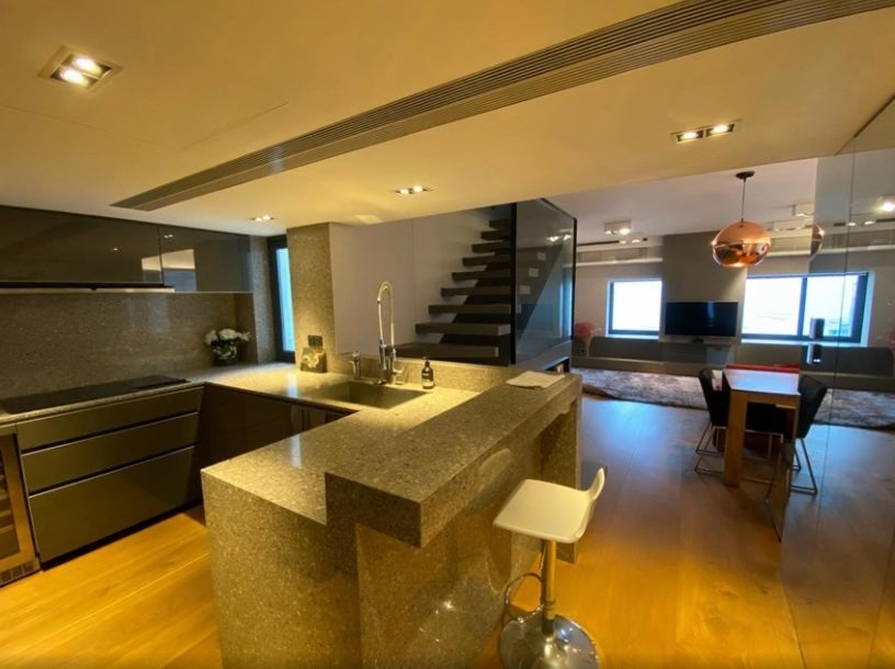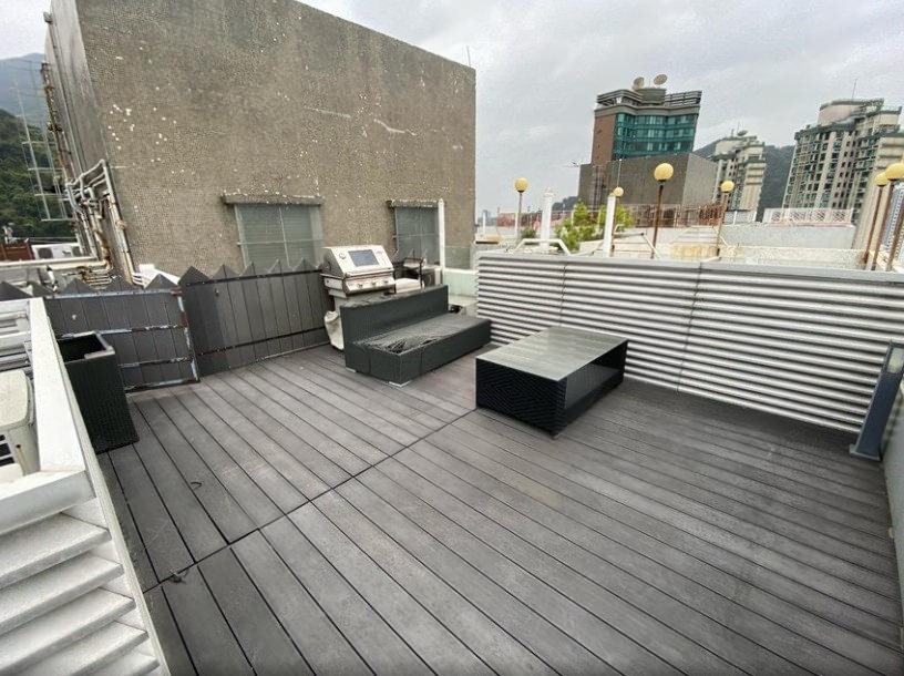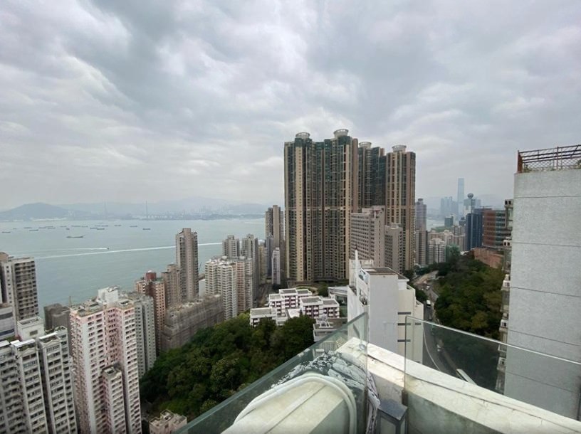 A spacious 2-bedroom penthouse duplex for sale in Academic Terrace, 101 Pok Fu Lam Road. Features a balcony, terrace, and large roof area overlooking an open greenish, city, & sea views.