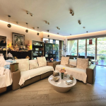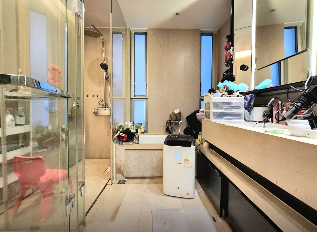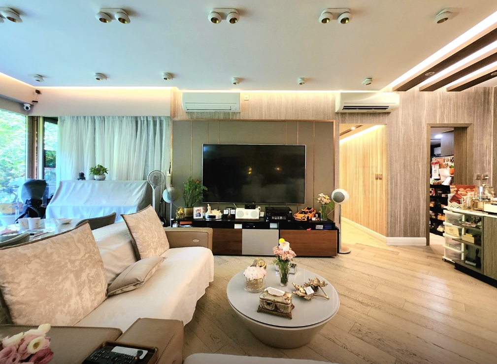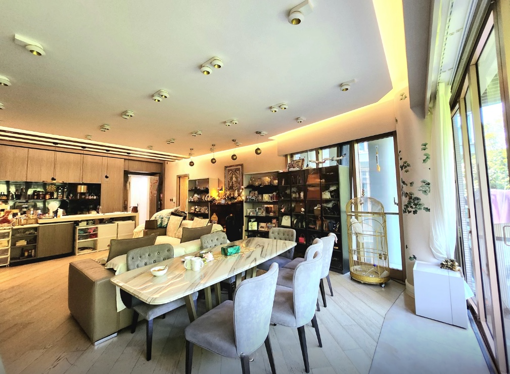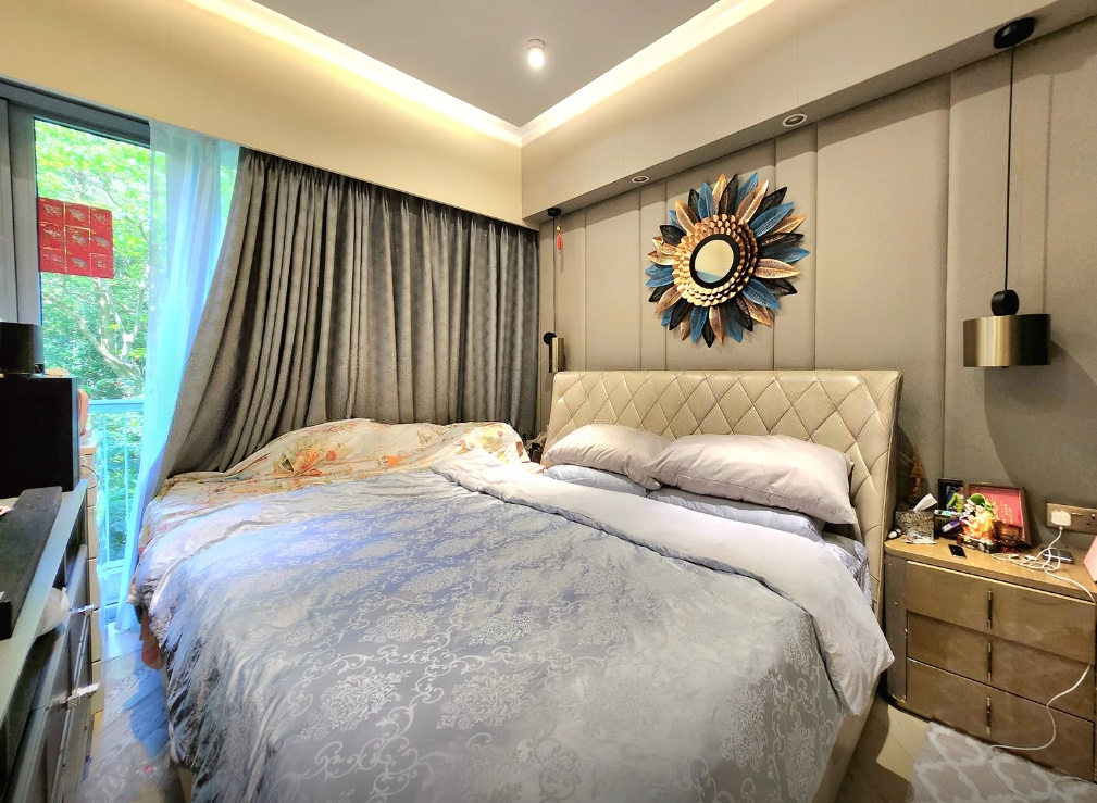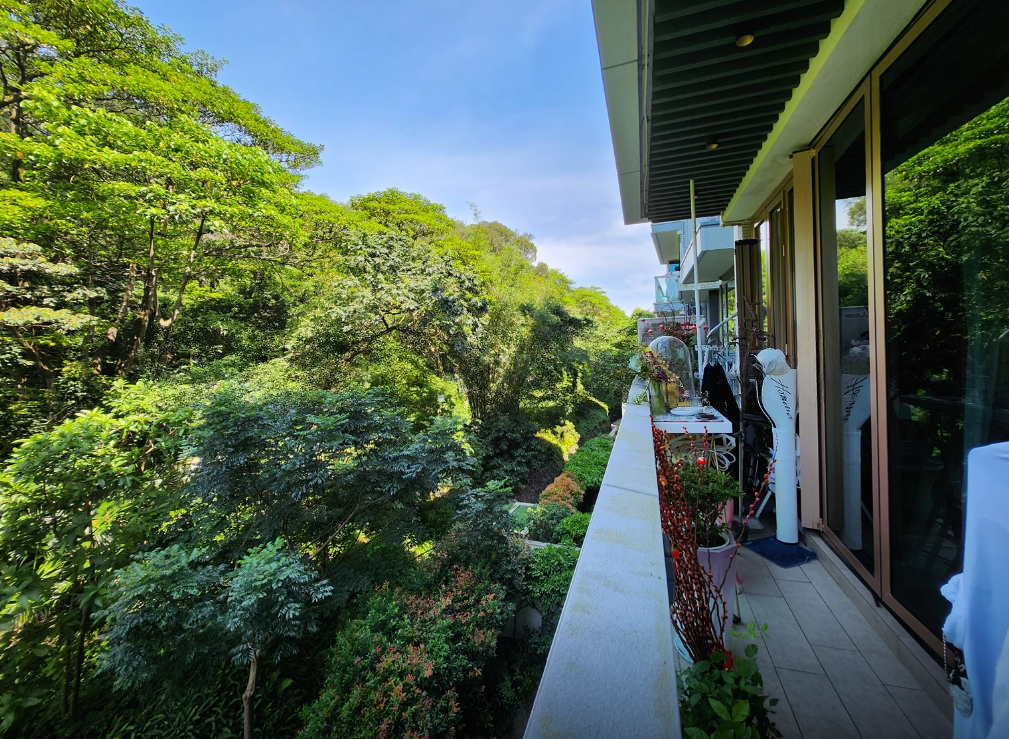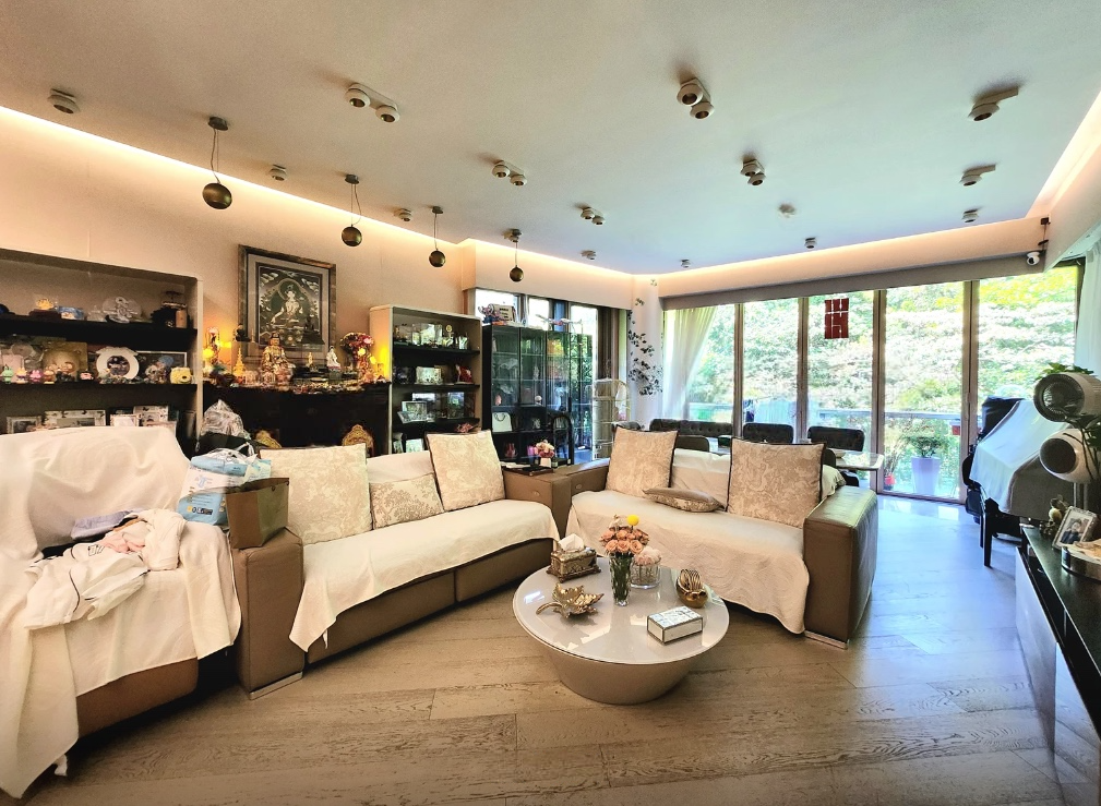 A spacious 4-bedroom apartment for rent in a gated complex in Mount Pavilia, located at 663 Clear Water Bay Road. Features high ceilings, expansive windows, and a balcony overlooking a lush greenery.