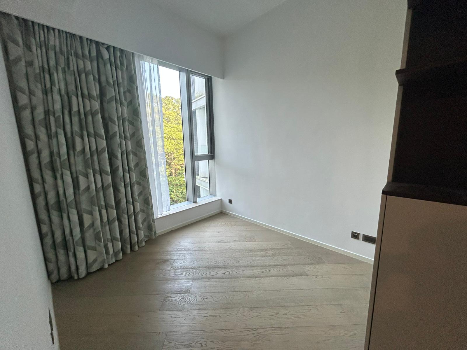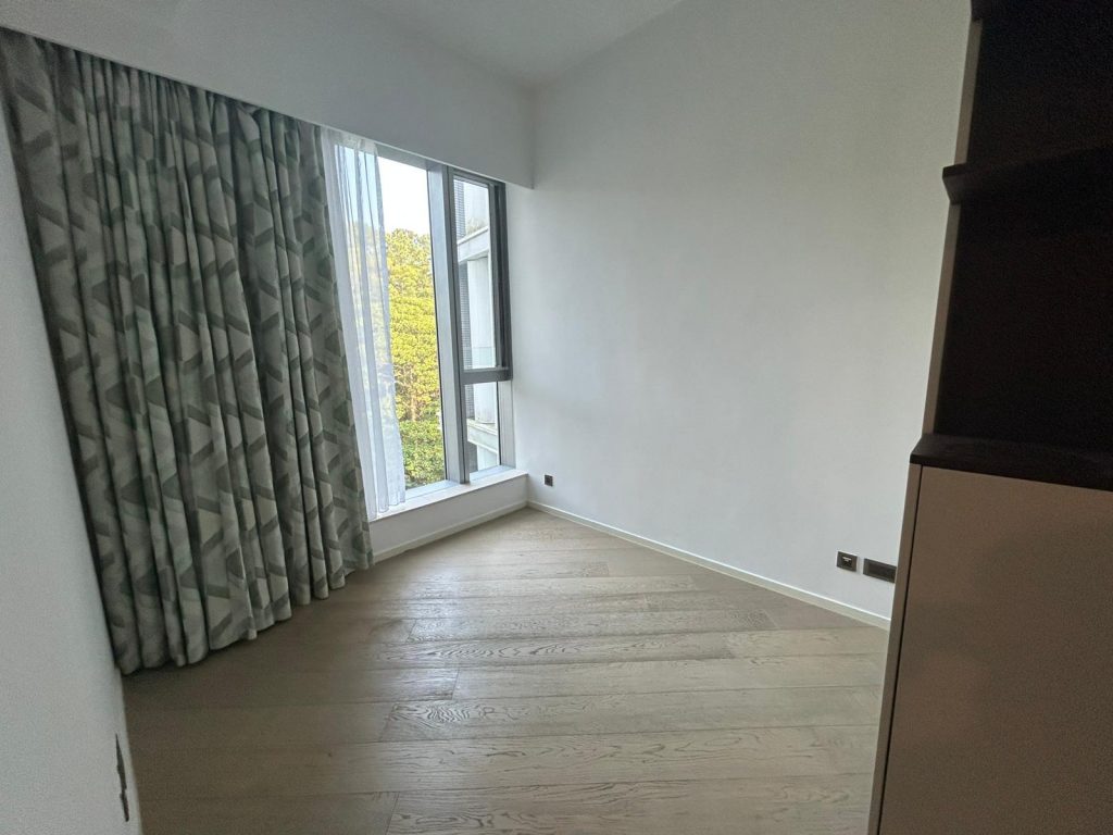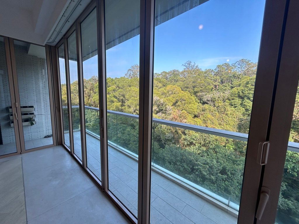 A luxurious 4-bedroom apartment for rent in Mount Pavilia, located at 663 Clear Water Bay Road. Offers high ceilings, expansive windows, and a large L-shaped terrace overlooking a lush greenery.