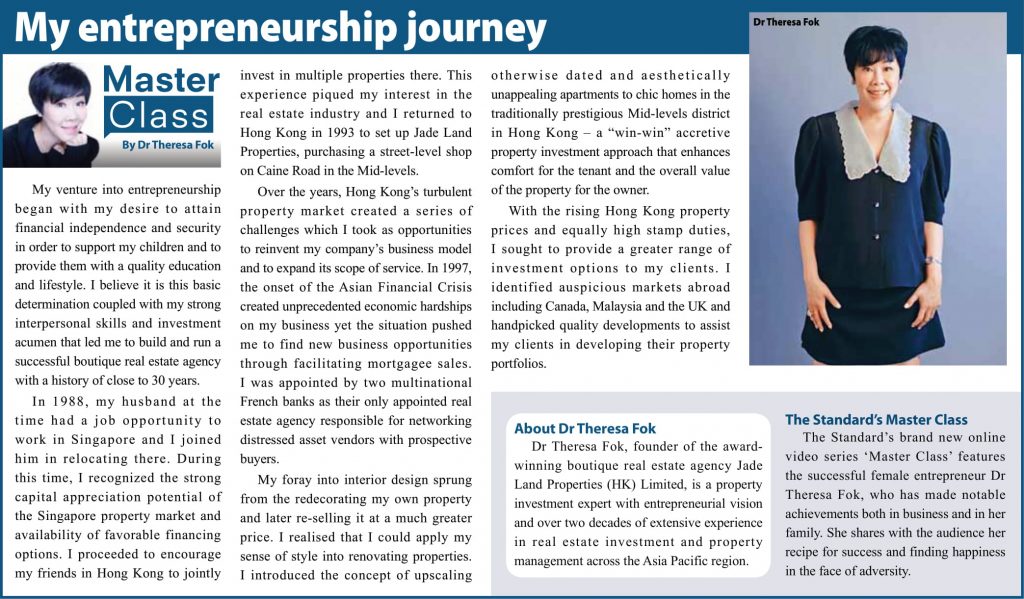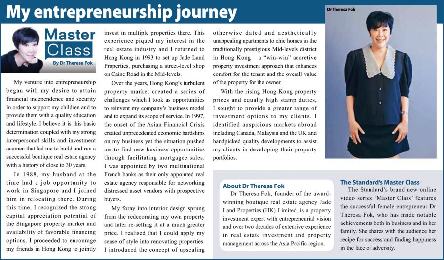 The Standard’s brand new online video series ‘Master Class’ features the successful female entrepreneur Dr Theresa Fok, who has made notable achievements both in business and in her family. She shares with the audience her recipe for success and finding happiness in the face of adversity.
